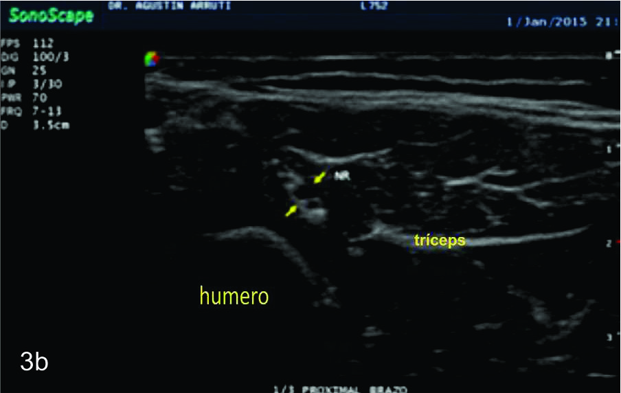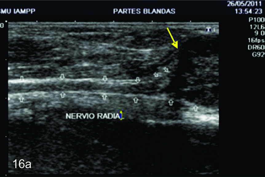 A- Se observa un corte longitudinal del nervio radial proximal a la lesión (flechas blancas