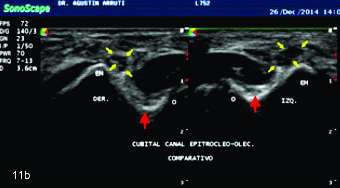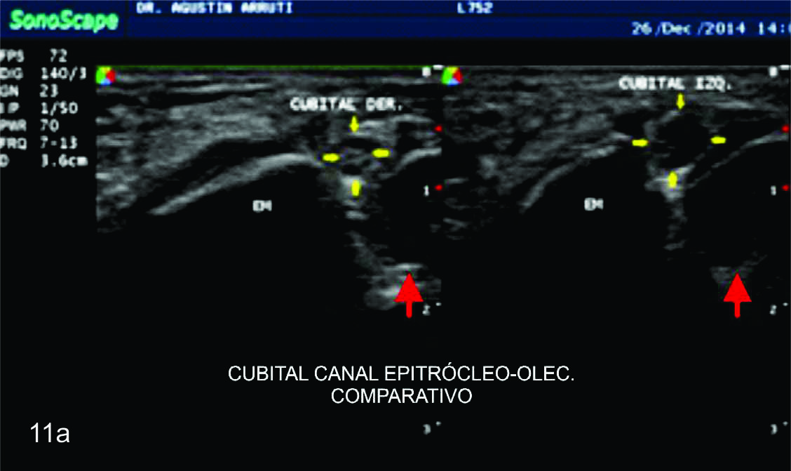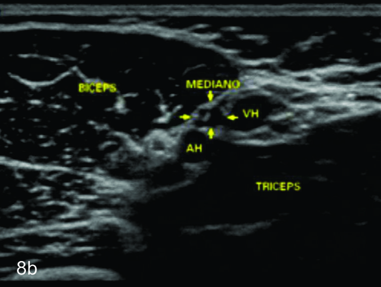 cubital (flechas blancas abiertas). B- Corte transversal del mismo paciente en donde se identifica