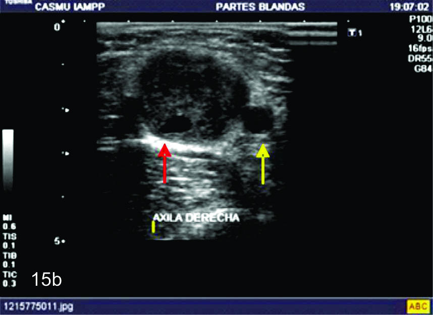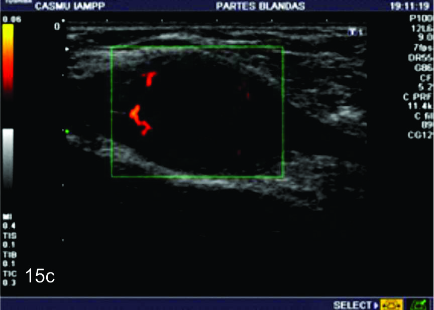 axilar. C- Con el empleo del Doppler de potencia se observa como el tumor se encuentra