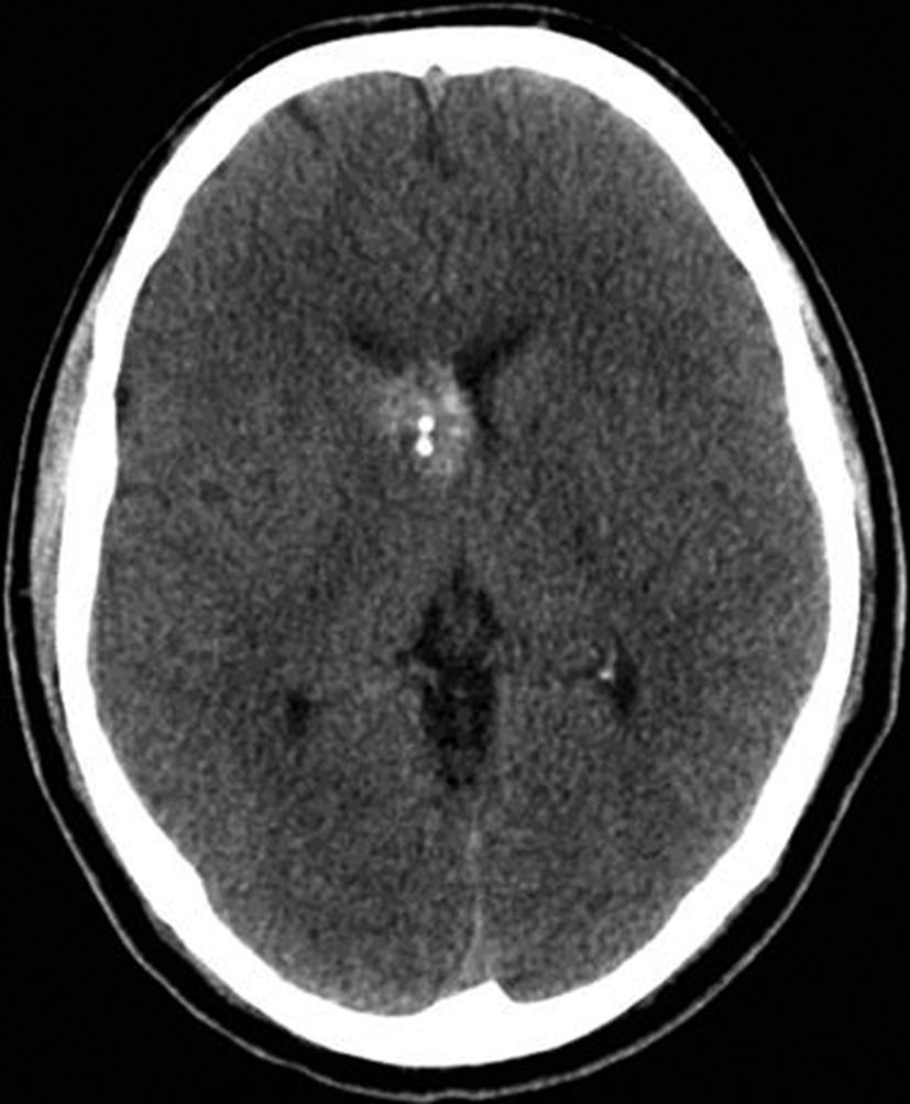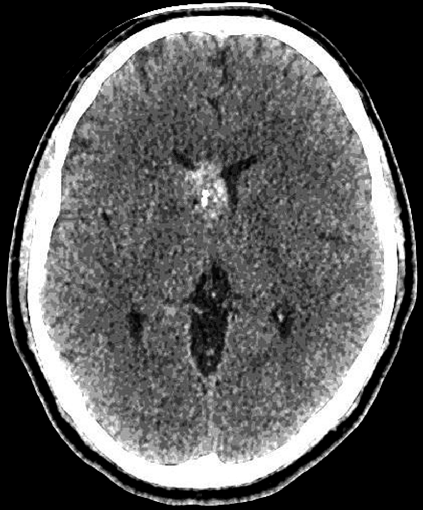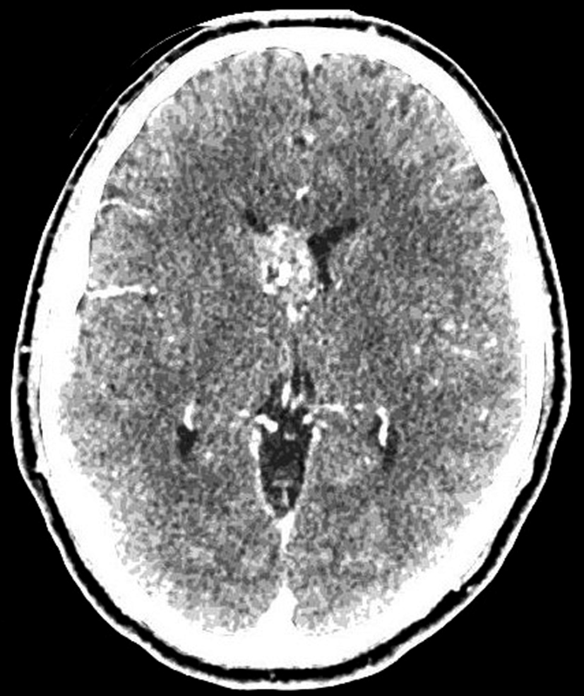 Se presenta el caso clínico de un paciente de sexo masculino, de 36 años de edad, sin antecedentes personales a destacar. Consulta por cefalea holocraneana de larga data, sin déficit neurológico y examen físico normal. Dada la clínica del paciente se realiza una tomografía computada de cráneo sin contraste intravenoso que identifica una lesión bien definida espontáneamente hiperdensa, heterogénea con calcificaciones puntiformes localizada en el asta frontal del ventrículo lateral derecho. No hay edema peri-lesional, efecto de masa ni hidrocefalia (Figura 1- A). Debido a los hallazgos se decide administrar contraste intravenoso, no evidenciándose realce significativo de la lesión (Figura 1- B).